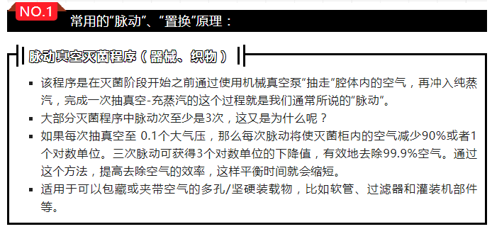 脈動真空滅菌程序(器械、織物):該程序是在滅菌階段開始之前通過使用機械真空泵“抽走”腔體內(nèi)的空氣,再沖入純蒸汽,完成一次抽真空-充蒸汽的這個過程就是我們通常所說的“脈動”。