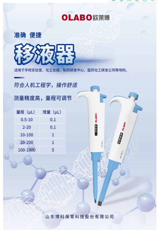 國產OLABO,B系列單道可調式移液器10-100μl量程:10-100μl,精確分液,數字視窗,符合人體工學,握姿舒適
